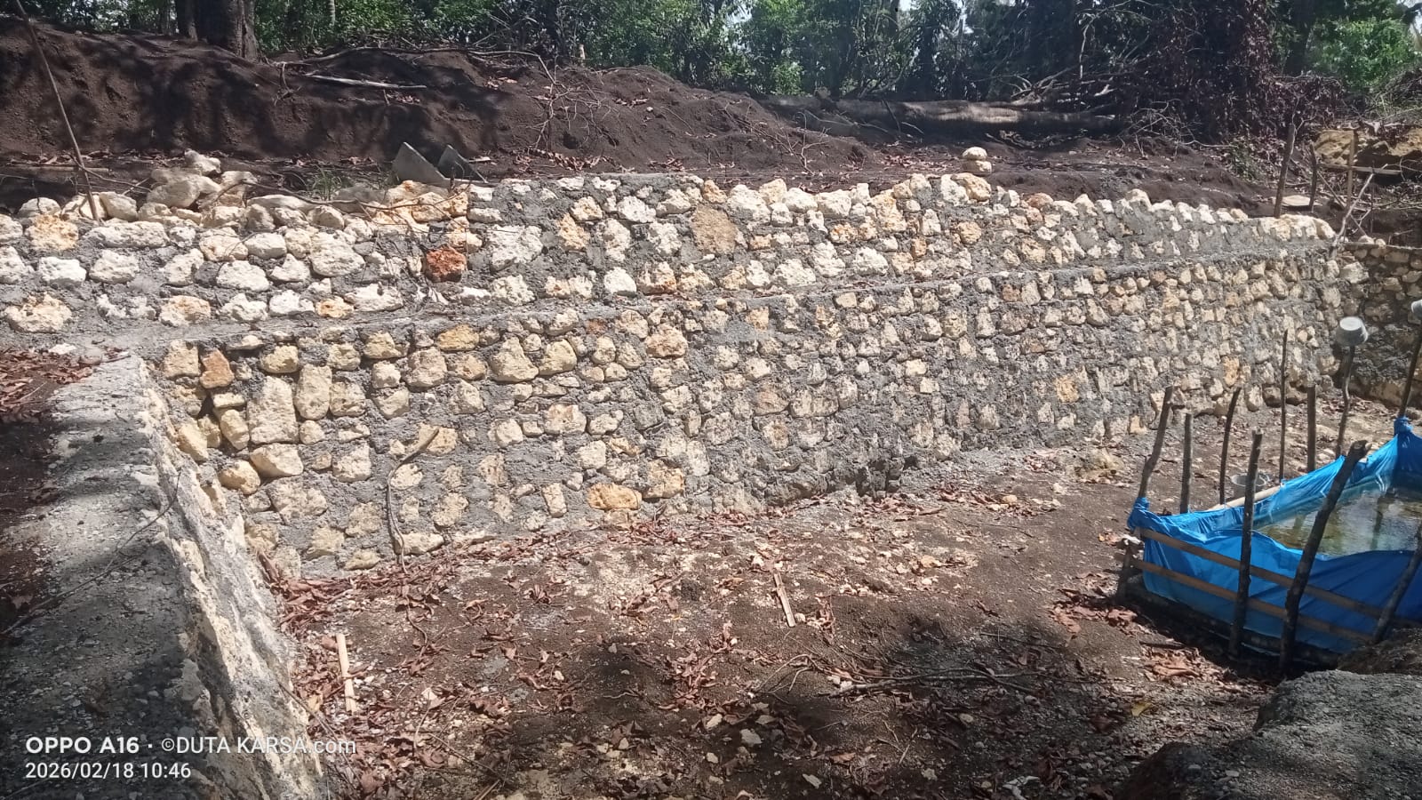 Dari foto di lapangan, pasangan batu terlihat cukup rapat, namun adukan dinilai kurang rapi dan tidak tampak perbedaan lebar antara bagian pondasi dan badan dinding yang biasanya lebih lebar di bagian bawah.