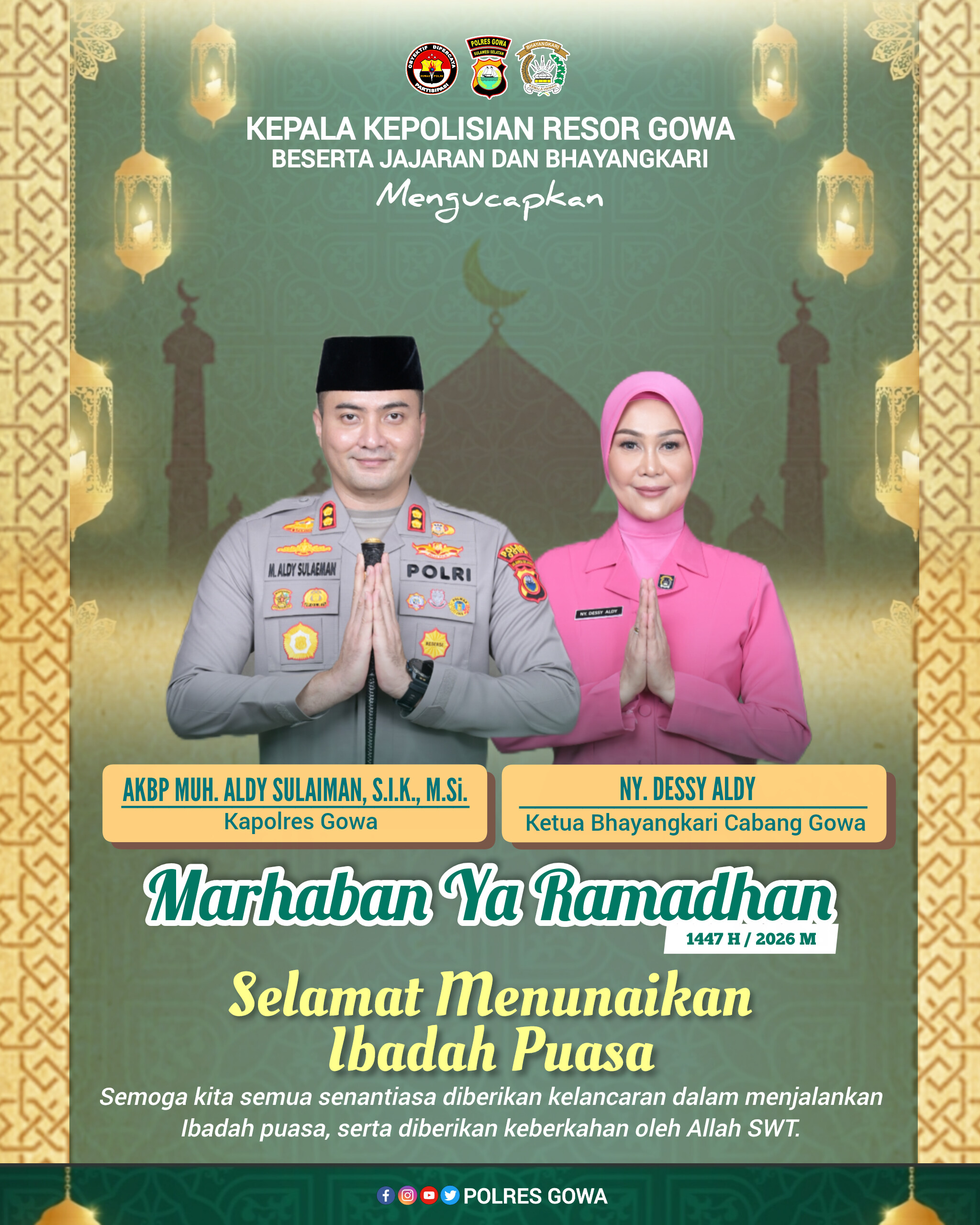 “Atas nama pribadi, keluarga besar Polres Gowa dan Bhayangkari, kami mengucapkan “Marhaban Ya Ramadhan” 1447 H/2026 M. Selamat menunaikan ibadah puasa. Semoga Allah SWT senantiasa melimpahkan rahmat, ampunan dan keberkahan-Nya kepada kita semua,” ujar AKBP Muh. Aldy Sulaiman.