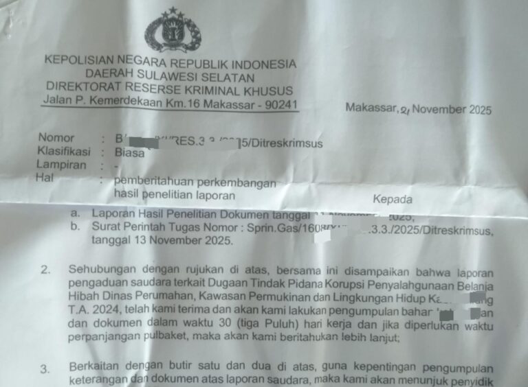 Makassar, DUTAKARSA.COM — Penanganan laporan dugaan korupsi dana hibah sekitar Rp8 miliar yang terjadi di Kabupaten Pinrang kembali menjadi sorotan publik. Pasalnya, laporan tersebut telah disampaikan sejak November 2025, namun hingga kini diduga belum menunjukkan tindak lanjut yang signifikan dari aparat penegak hukum.