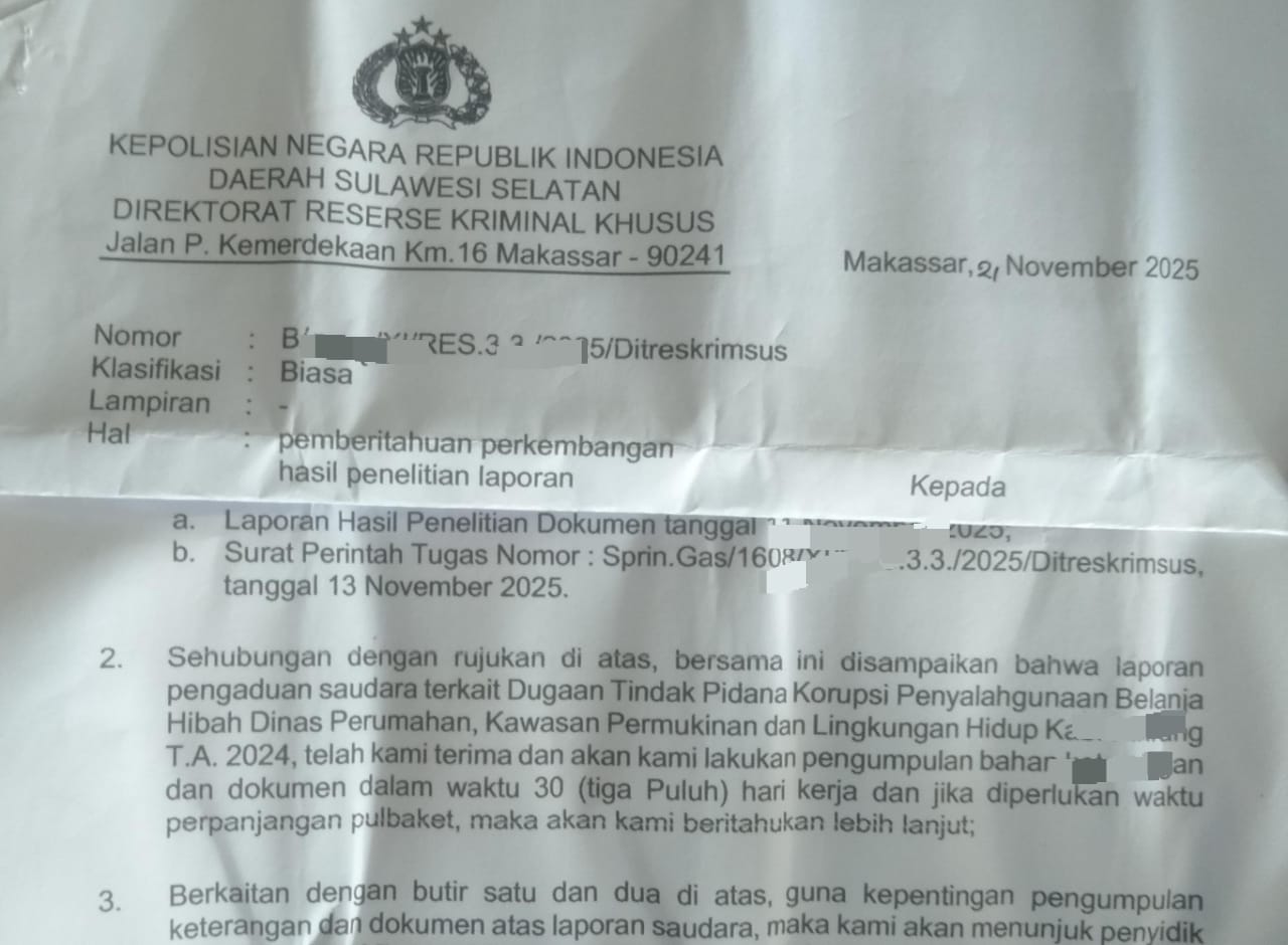 Ketua Bidang Hukum dan HAM Pengurus Wilayah Serikat Mahasiswa Muslimin Indonesia (SEMMI) Sulawesi Selatan, Arie Musa, mengungkapkan bahwa pihaknya telah menerima Surat Pemberitahuan Perkembangan Hasil Penyelidikan (SP2HP) tertanggal 21 November 2025 dengan Nomor: B/8007/XI/RES.3.3/2025/Ditreskrimsus.