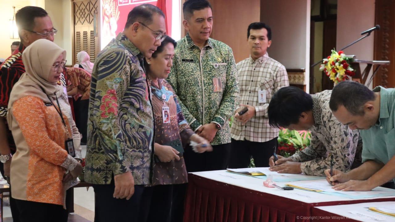 Jakarta – Plh. Kakanwil Kemenkum DK Jakarta Andi Yulia Hertaty didampingi Kabid Pelayanan AHU Sukino menghadiri Penandatangan secara serentak Akta Pendirian Badan Hukum Koperasi Kelurahan Merah Putih di Wilayah Jakarta Pusat, Kamis (26/06/2025) bertempat di Kantor Walikota Jakarta Pusat. Kegiatan penandatanganan ini dihadiri oleh seluruh kelurahan yang ada di Wilayah Jakarta Pusat yakni 44 Kelurahan. Dalam sambutannya Kepala Dinas PPKUKM Provinsi DKI Jakarta Elisabeth Ratu Rante Allo menyampaikan kepada seluruh jajaran kelurahan untuk turut aktif dan berkontribusi mensukseskan jalannya Koperasi Kelurahan Merah Putih ini. Lebih lanjut Ia juga menyampaikan kepada Camat dan Lurah untuk ikut mengawasi jalannya Koperasi ini agar tidak ada penyimpangan yang dapat menimbulkan kerugian.